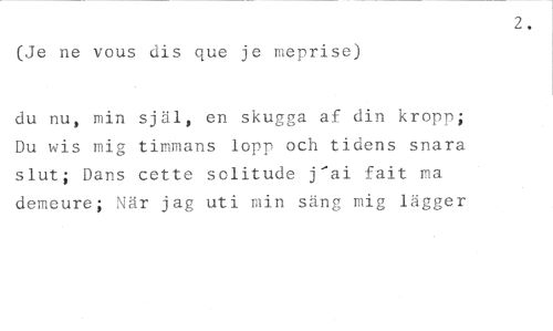 (Je ne vous dis que je meprise) //// du nu, min själ, en skugga af din kropp; Du wis mig timmans lopp och tidens snara slut; Dans cette solitude j'ai fait ma demeure; När jag uti min säng mig lägger //// 2.
