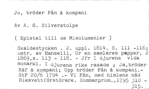 Jo, bröder Fån & kompani Av A. G. Silverstolpe //// ( Epistel till de Misolumenier ) //// Skaldestycken . 2. uppl. 1814. S. 111 -116; omtr. av Hanselli, Ur en samlares papper, 2 1869,s. 113 - 118. - Jfr I djurens vida //// monarki. I djurens rike rasade ; Ja,bröder Räf & kompani; Upp bröder Fån & kompani.- StP 20/6 1794 .- Vi Fån, med himlens nåd Riksvettförstörare. Sommarprom.,1795 310 - //// 315•___