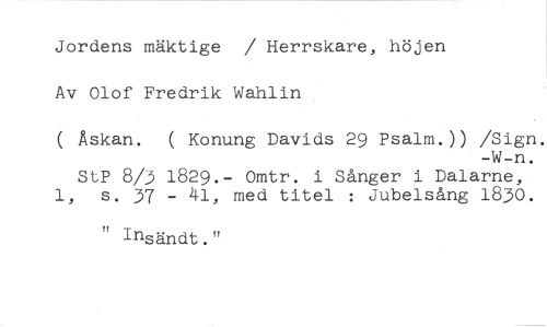 Jordens mäktige / Herrskare, höjen Av Olof Fredrik Wahlin //// ( Åskan. ( Konung Davids 29 Psalm.)) /Sign. //// -W-n. //// StP 8/5 1829.- Omtr. i Sånger i Dalarne, 1, s. 37 - 41, med titel : Jubelsång 1830. //// tt Insändt."'