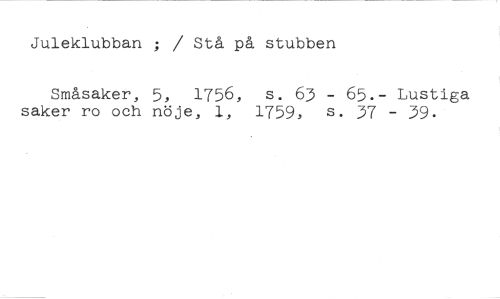 Juleklubban ; / Stå på stubben //// Småsaker, 5, 1756, s. 63 - 65.- Lustiga saker ro och nöje, 1, 1759, s. 37 - 39.