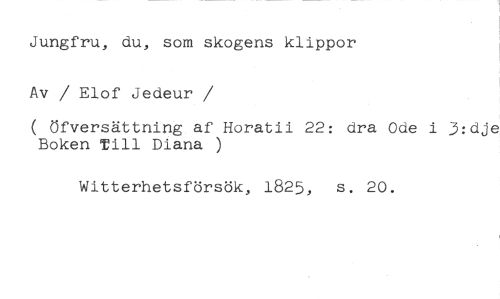 Jungfru, du, som skogens klippor Av / Elof Jedeur //// /( öfversättning af Horatii 22: dra Ode i 3:dje Boken Till Diana ) //// Witterhetsförsök, 1825, s. 20.