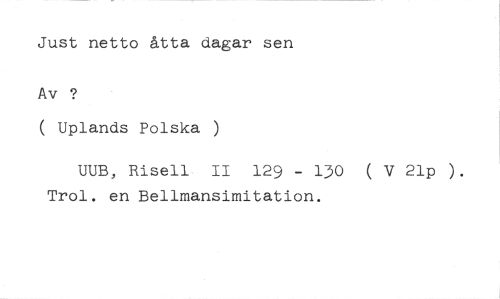 Just netto åtta dagar sen //// Av ? //// ( Uplands Polska ) //// UUB, Risell II 129 - 130 ( V 21p ). Trol. en Bellmansimitation.