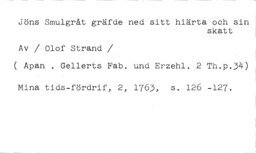 Jöns Smulgråt gräfde ned sitt hiärta och sin //// skatt //// Av / Olof Strand //// /( Apan . Gellerts Fab. und Erzehl. 2 Th.p.34) //// Mina tids-fördrif, 2, 1763, s. 126 -127.