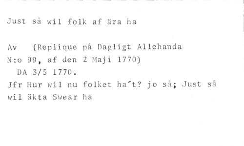 Just så wil folk af ära ha //// Av (Replique på Dagligt Allehanda //// N:o 99, af den 2 Maji 1770) //// DA 3/5 1770. //// Jfr Hur wil nu folket hast? jo så; Just så wil äkta Swear ha