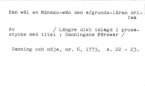 Kan wäl en Mänsko-wän den afgrunds-läran dti-, //// fwa //// Av / Längre dikt inlagd i prosa- //// stycke med titel : Sanningens Förswar //// /Sanning och nöje, nr. 6, 1779, s. 22 - 23.
