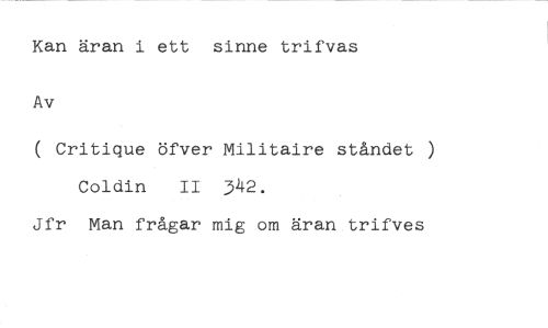 Kan äran i ett sinne trifvas Av //// ( Critique öfver Militaire ståndet ) Coldin II 342. //// Jfr Man frågar mig om äran trifves