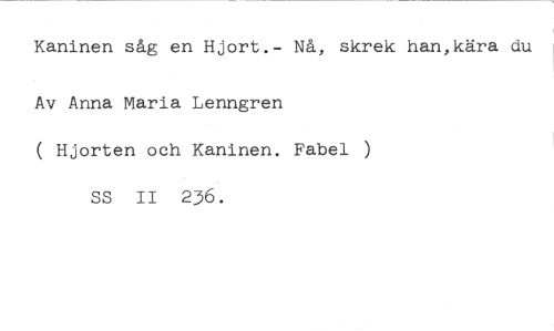 Kaninen såg en Hjort.- Nå, skrek han,kära du //// Av Anna Maria Lenngren //// ( Hjorten och Kaninen. Fabel ) SS II 236.