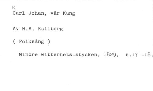 Carl Johan, vår Kung //// Av H.A. Kullberg ( Folksång ) //// Mindre witterhets-stycken, 1829, s.17 -18.