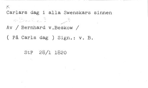 Carlars dag i alla Swenskars sinnen //// Av / Bernhard v.Beskow //// /( På Carls dag ) Sign.: v. B. //// StP 28/1 1820