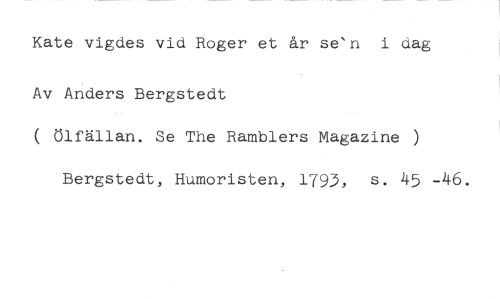 Kate vigdes vid Roger et år se'n i dag //// Av Anders Bergstedt //// ( Ölfällan. Se The Ramblers Magazine ) Bergstedt, Humoristen, 1793, s. 45 -46.