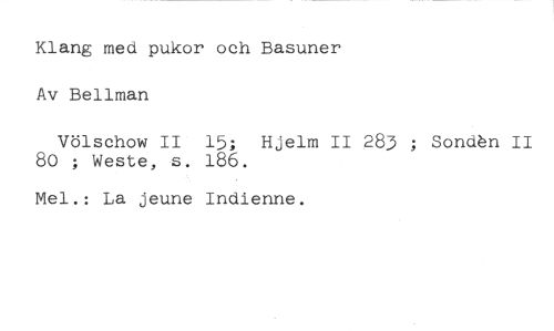 Klang med pukor och Basuner Av Bellman //// Völschow II 15; Hjelm II 283 ; SoncAn II 80 ; Weste, s. 186. //// Mel.: La jeune Indienne.