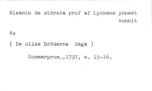 Kleanth de största prof af Lyckans ynnest //// vunnit //// Av //// ( De olike Bröderne Saga ) //// Sommarprom.,1797, s. 15-16.