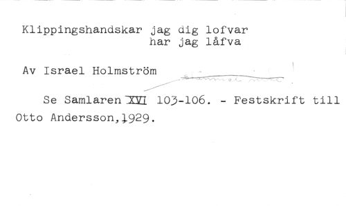 Klippingshandskar jag dig lofvar //// har jag låfva //// Av Israel Holmström //// Se Samlaren-XVI 103-106. - Festskrift till Otto Andersson, .929.