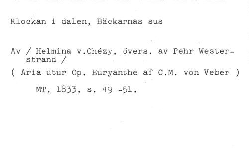 Klockan i dalen, Bäckarnas sus //// Av / Helmina v.C1Azy, övers. av Pehr Wester-strand //// /( Aria utur Op. Euryanthe af C.M. von Veber ) MT, 1833, s. 49 -51.