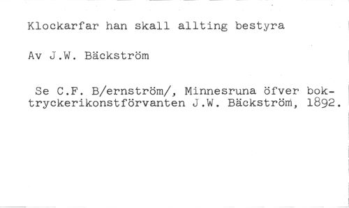 Klockarfar han skall allting bestyra Av J.W. Bäckström //// Se C.F. B/ernström/, Minnesruna öfver bok- //// tryckerikonstförvanten J.W. Bäckström, 1892.