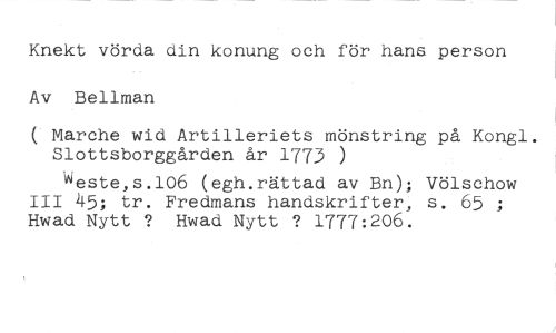 Knekt vörda din konung och för hans person Av Bellman //// ( Marche wid Artilleriets mönstring på Kongl. Slottsborggården år 1773 ) //// Weste,s.106 (egh.rättad av Bn); Völschow III 45; tr. Fredmans handskrifter, s. 65 ; Hwad. Nytt ? Hwad Nytt ? 1777:206.