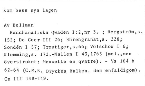 Kom bess nya lagen //// Av Bellman //// Bacchanaliska Qwäden I:2,nr 3. ; Bergström,s. 152; De Geer III 26; Ehrengranat,s. 228; Sonden I 57; Treutiger,s.66; Völschow I 6; Klemming,s. 172.-Wallen I 43,1765 (mel.,men överstruket: Menuette en qvatre). - Vs 104 b //// 62-64 (C.M.B. Dryckes Balken. dem enfaldigom). Cn III 148-149.