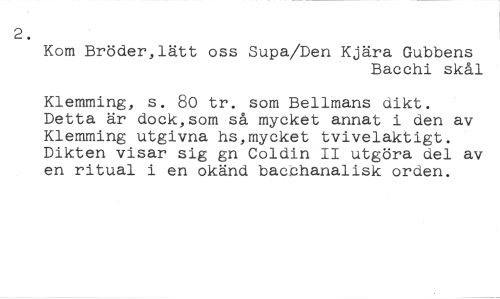 2. //// Kom Bröder,lätt oss Supa/Den Kjära Gubbens //// Bacchi skål //// Klemming, s. 80 tr. som Bellmans dikt. Detta är dock,som så mycket annat i den av Klemming utgivna hs,mycket tvivelaktigt. Dikten visar sig gn Coldin II utgöra del av en ritual i en okänd bac'ehanalisk orden.