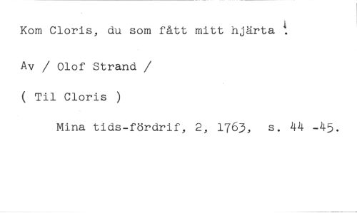 Kom Cloris, du som fått mitt hjärta t //// Av / Olof Strand / ( Til Cloris //// Mina tids-fördrif, 2, 1763, s. 44 -45.