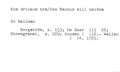 Kom drickom bra/Oss Bachus will belöna Av Bellman //// Bergström, s. 153; De Geer III 28; //// Ehrengranat, s. 229; Sonden I 118.- Wallen //// 64, 1765.