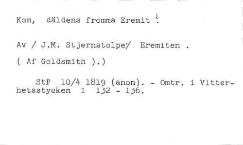 Kom, däldens fromma Eremit i //// Av / J.M. Stjernstolpe/ Eremiten ( Af Goldsmith ).) //// StP 10/4 1819 (anon). - Omtr. i Vitterhetsstycken I 132 - 136.