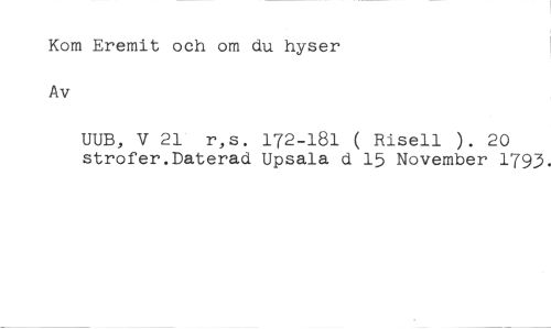 Kom Eremit och om du hyser Av //// UUB, V 21 r,s. 172-181 ( Risell ). 20 strofer.Daterad Upsala d 15 November 1793.