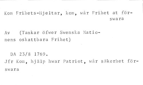 Kom Frihets- jeltar, kom, wir Frihet at för- //// swara //// Av (Tankar öfwer Swenska Natio- //// nens oskattbara Frihet) //// DA 23/8 1769. //// Jfr Kom, hjälp hwar Patriot, wår säkerhet förswara