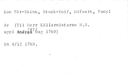 Kom För-Skinn, Stock-Knif, Häfwert, Pump! Av (Til Herr Källarmästaren N.N. //// /ä?L //// uppå Andre4 uag 1769) //// DA 4/12 1769.