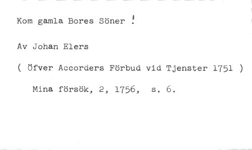 Kom gamla Bores Söner ! //// Av Johan Elers //// ( öfver Accorders Förbud vid Tjenster 1751 ) Mina försök, 2, 1756, s. 6.