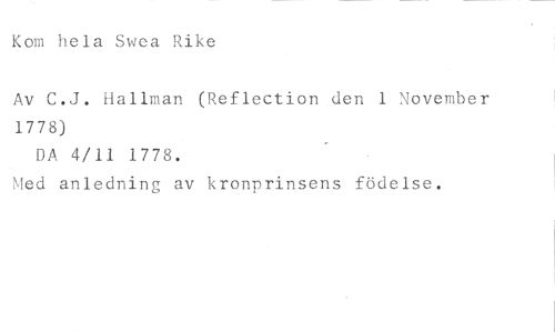 Kom hela Swea Rike //// Av C.J. Hallman (Reflection den 1 November 1778) //// DA 4/11 1778. //// Med anledning av kronprinsens födelse.