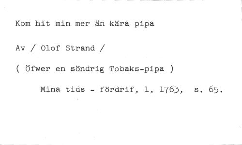 Kom hit min mer än kära pipa //// Av / Olof Strand //// /( öfwer en söndrig Tobaks-pipa ) //// Mina tids - fördrif, 1, 1763, s. 65.