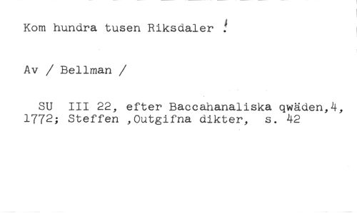 Kom hundra tusen Riksdaler Av / Bellman //// /SU III 22, efter Baccahanaliska qwäden,4, 1772; Steffen ,Outgifna dikter, s. 42