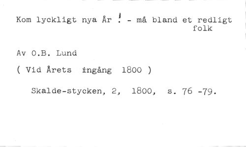 Kom lyckligt nya Är - må bland et redligt //// folk //// Av O.B. Lund //// ( Vid Årets ingång 1800 ) //// Skalde-stycken, 2, 1800, s. 76 -79.
