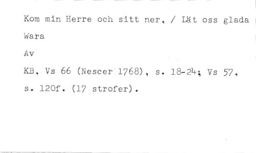 Kom min Herre och sitt ner, / Lät oss glada Wara //// Av //// KB, Vs 66 (Nescer 1768), s. 18-24; Vs 57, s. 120f. (17 strofer).