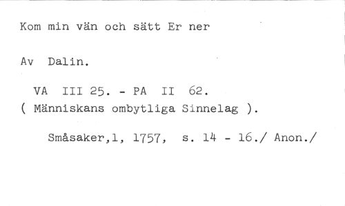Kom min vän och sätt Er ner Av Dalin. //// VA III 25. - PA II 62. //// ( Människans ombytliga Sinnelag ). //// Småsaker,l, 1757, s. 14 - 16./ Anon. //// /