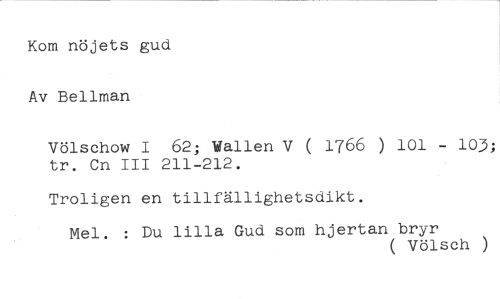 Kom nöjets gud Av Bellman //// Völschow I 62; Vallen V ( 1766 ) 101 - 103; tr. Cn III 211-212. //// Troligen en tillfällighetsdikt. //// Mel. : Du lilla Gud som hjertan bryr //// ( Völsch )