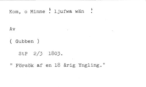 Kom, o Minne ! ljufwa wän //// Av //// ( Gubben ) //// StP 2/3 1803. //// " Försök af en 18 årig Yngling."
