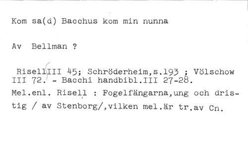Kom sa(d) Bacchus kom min nunna Av Bellman ? //// RisellIII 45; Schröderheim,s.193 ; Völschow //// III - Bacchi handbibl.III 27-28. //// Mel.enl. Risell : Fogelfängarna,ung och dristig / av Stenborg/,vilken mel.är tr av Cn.