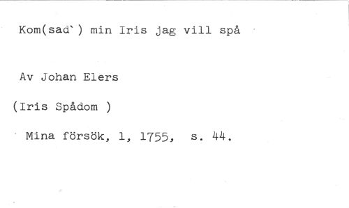 Kom(sad') min Iris jag vill spå //// Av Johan Elers (Iris Spådom ) //// Mina försök, 1, 1755, s. 44.