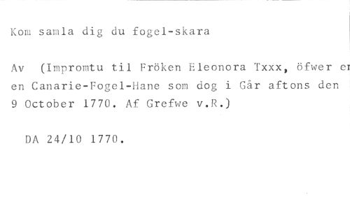 Kom samla dig du fogel-skara //// Av (Impromtu til Fröken Eleonora Txxx, öfwer e/ en Canarie-Fogel-Hane som dog i Går aftons den 9 October 1770. Af Grefwe v.R.) //// DA 24/10 1770.