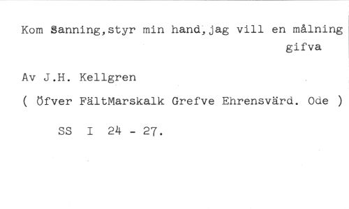 Kom Sanning,styr min hand, jag vill en målning //// gifva //// Av J.H. Kellgren //// ( öfver FältMarskalk Grefve Ehrensvärd. Ode ) //// SS I 24 - 27.