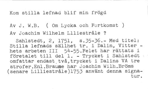 Kom stilla lefnad blif min frögd //// Av J. W.B. ( Om Lycka och Fortkomst ) Av Joachim Wilhelm Liliestråle ? //// Sahlstedt, 2, 1751, s.35-36.- Med titel: Stilla lefnads sällhet tr. i Dalin, Vitter hets arbeten III 54-55.Felet har rättats i företalet till del 1. - Trycket i Sahlstedt omfattar endast.två,trycket i Dalins VA tre strofer.Enl.Braume har Joachim Wilh.Bröms //// (senare Lilliestråle)1753 använt denna signa- //// tur.