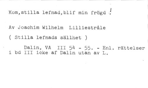 Kom,stilla lefnad,blif min frögd //// Av Joachim Wilhelm Lilliestråle ( Stilla lefnads sällhet ) //// Dalin, VA III 54 - 55. - Enl. rättelser i bd III icke af Dalin utan av L.