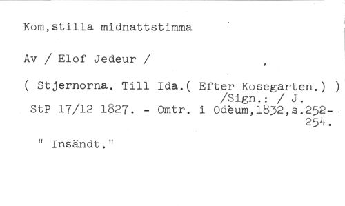 Kom,stilla midnattstimma Av / Elof Jedeur //// /( Stjernorna. Till Ida.( Efter Kosegarten.) ) //// /Sign.: / J. //// StP 17/12 1827. - Omtr. i Odum,1832,s.252- //// 254. //// " Insändt."