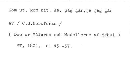 Kom ut, kom hit. Ja, jag går,ja jag går //// Av / C.G.Nordforss //// /( Duo ur Målaren och Modellerne af Mhul ) MT, 1804, s. 45 -57.
