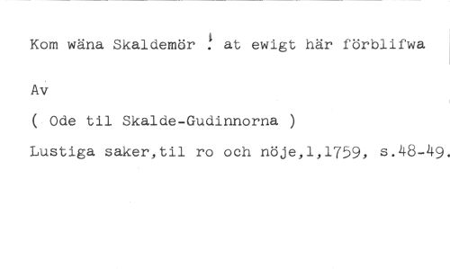 I //// Kom wäna. Skaldemör . at ewigt här förblifwa //// Av //// ( Ode til Skalde-Gudinnorna //// Lustiga saker,til ro och nöje,1,1759, s.48-49.
