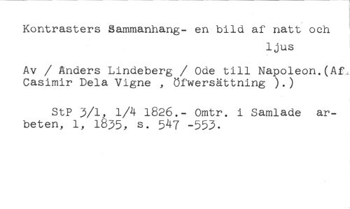 Kontrasters Sammanhang- en bild af natt och //// ljus //// Av / Anders Lindeberg / Ode till Napoleon.(Af, Casimir Dela Vigne , öfwersättning ).) //// StP 3/1, 1/4 1826.- Omtr. i Samlade arbeten, 1, 1835, s. 547 -553.