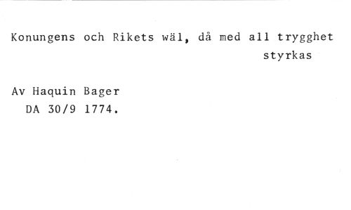 Konungens och Rikets wäl, då med all trygghet //// styrkas //// Av Haquin Bager DA 30/9 1774.