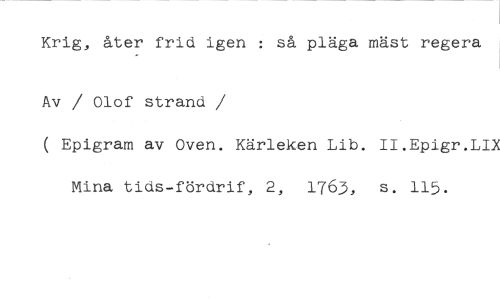 Krig, åter frid igen : så pläga mäst regera //// Av / Olof strand //// /( Epigram av Oven. Kärleken Lib. II.Epigr.LIX Mina tids-fördrif, 2, 1763, s. 115.