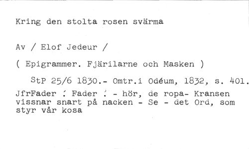 Kring den stolta rosen svärma //// Av / Elof Jedeur //// /( Epigrammer. Fjärilarne och Masken ) //// Stp 25/6 1830.- Omtr.i OcAum,. 1832, s. 401. //// JfrFader : Fader - hör, de ropa- Kransen vissnar snart på nacken - Se - det Ord, som styr vår kosa